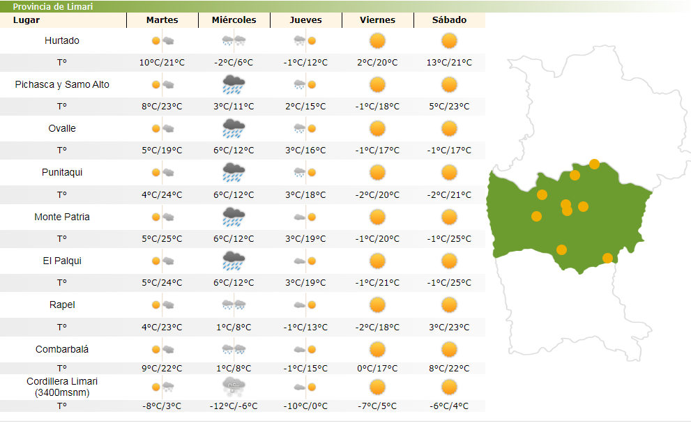 Según el Centro de Estudios Avanzados en Zonas Áridas (CEAZA), el sector precordillerano se verá afectado por las heladas desde el miércoles al viernes, junto con las nevadas mencionadas anteriormente, mientras que los valles serán afectados por heladas desde el jueves por la noche hasta el sábado.